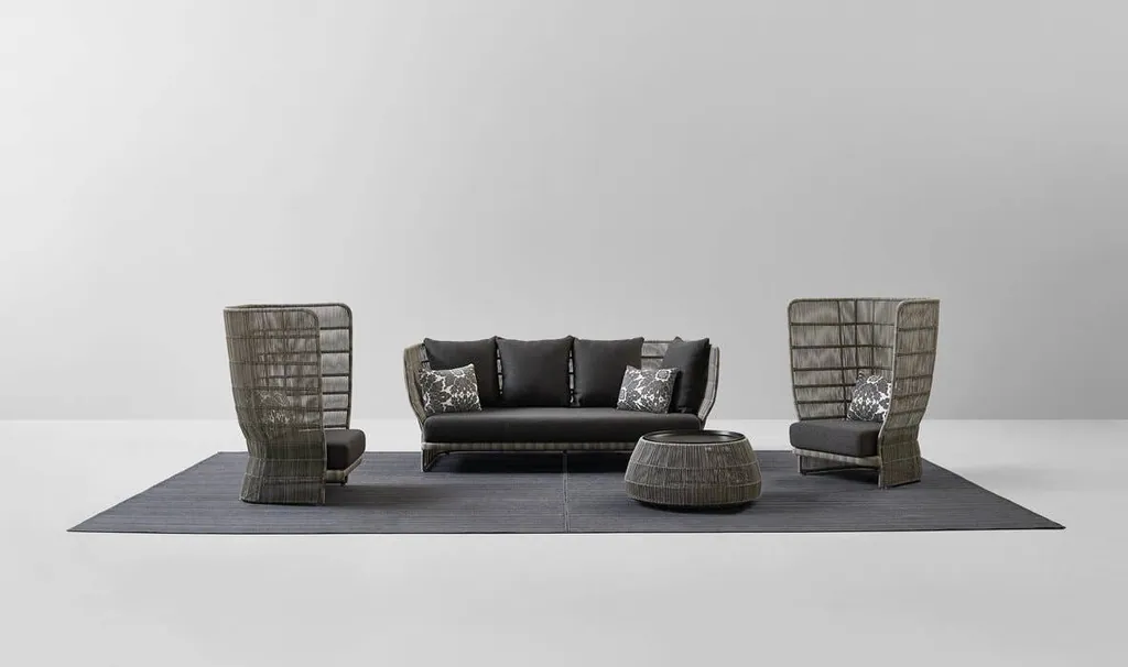 Canasta Gartenmöbel von B&B Italia, Designer: Patricia Urquiola. Eine Reihe von Sitzsystem aus Makrogeflecht von Polyethylenfaser-Bändern weiß und bronzefarben. Zahlreiche Versionen werden angeboten: runde und gerade Sofas, Sessel, Stühle, Chaise Longue und Beistelltische, die mit ausgesuchten einfarbigen, melangierten und gemusterten Stoffen in verschiedenen Farbvarianten bezogen werden können. Die äußerst komfortablen Sitzsystem habenalle eine Gestell aus Aluminium mit klimabeständigen Polyesterpulverlackierung. Sie sind in den Farben weiß oder bronzefarben mit Polyethylenfaser-Geflecht in der gleichen Farbe wie die Gestell erhältlich. Der runde Sitz kann mit einem leichten, rückklappbaren Verdeck versehen werden, das die Sonnenstrahlen bis zu 92% abhält. Darüber hinaus ist eine um 360° drehbare Untergestell einsetzbar. Die Canasta Kollektion wird durch Tische und Beistelltische in verschiedenen Größen ergänzt. Die Tische haben ein Aluminiumgestell, während die Beistelltische in Stahl gefertigt sind. Beide haben ein mit Polyesterpulverlackierung-Gestell, welche witterungsbeständig ist. Die Gestellfarbe ist weiß für Tische, weiß oder schwarz für Beistelltische, während die Platten mit exklusiven Fliesen bedeckt sind, welche die Dekore der Stoffe der Kollektion wiederaufnehmen. Der Streben nach Qualität in jeder Hinsicht hat schon immer die Exzellenz von B&B Italia garantiert. Entdecken Sie die Qualität der Materialien, aus denen unsere Produkte gemacht sind.