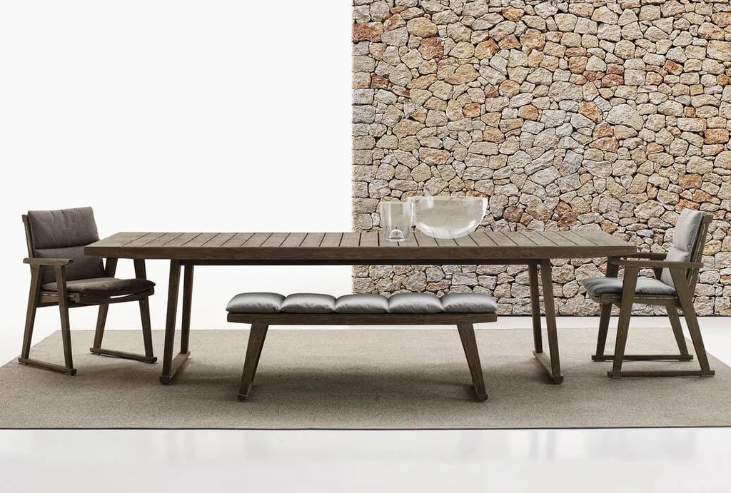 Dem Leben im Freien ist Gio gewidmet, die neue, von Antonio Citterio entworfene Kollektion mit klassisch-zeitgenössischen Akzenten. Eine komplette Familie mit Sofas, Eckelementen, Chaiselongues, Liegen, Sesseln, Stühlen, Tischen und Zubehör, die auf Strukturen aus massivem Teakholz in der der speziellen Farbe antique grey aufbaut. Diese verleiht dem Holz ein besonderes Used-Finish mit silbergrauen Reflexen. Aus praktischer Sicht bieten die verschiedenen Arten von Sofas, Eckelementen und Chaiselongues, die alle linear, eckig oder halbinselförmig kombiniert werden können, eine Basisstruktur mit Holzlatten, auf der Rahmen, Rückenlehne und Armlehne aufbauen, die sich durch geflochtene Bänder in tortora Farbe auszeichnen. Diese spezielle Struktur ermöglicht es, die verschiedenen Komponenten sehr einfach zu zerlegen, wodurch sich das Volumen reduziert, wenn die Möbel im Winter eingelagert werden. Die Sitze werden durch Kissen und Rückenpolster ergänzt, die exklusive Farbkombinationen bieten und Gio besonders bequem und komfortabel machen. Um einen besseren Wetterschutz zu gewährleisten, sind alle Polsterungen mit einem wasserdicht behandelten Polyesterfutter versehen, während die Stoffe für ihre Widerstandsfähigkeit gegen Wettereinflüsse, UV-Licht, gechlortes Wasser und Salz zertifiziert sind.