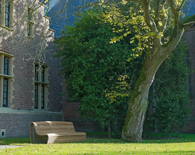 Der berühmte japanische Designer Naoto Fukasawa interpretiert die klassische Gartenbank neu und erschafft mit Titikaka eine Skulptur ähnliche Wirkung. Wie eine Welle sind die Teakleisten auf dem Aluminiumgestell angeordnet, die von vorne bis über die Rückenlehne zum Boden reichen.