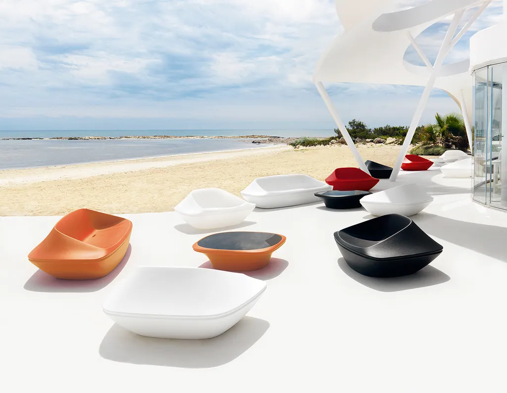The collection results from “genetic mutation experiments” between the iconic languages of pagodas and UFOs. It is characterised by the opposition of negative and positive shapes. This creative approach gave birth to a Marta Pan inspired monolithic, fluid and sculptural line that encourages comfort and relaxation. Its items make it possible to create different combinations which are easily adaptable to outdoor spaces thanks to its elegant and resistant materials. The colors, range of finishes and interior lighting expands the possibilities to create different environments.