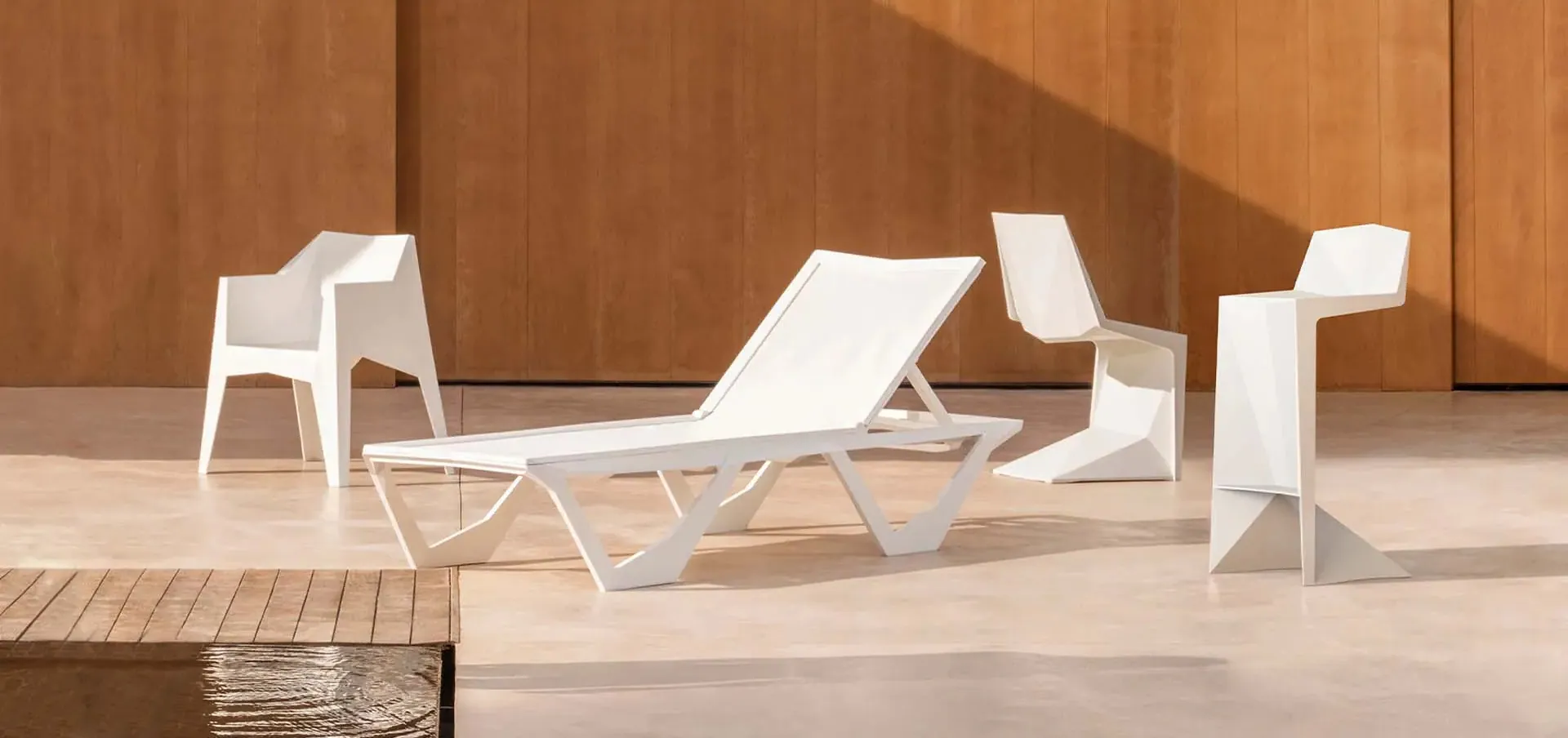 Die Designermöbelkollektion "Voxel Collection", entworfen von Karim Rashid für Vondom, zeichnet sich durch ihre geometrischen und facettierten Formen aus, die alle durch Spritzguss aus Kunststoff hergestellt werden. Die Kollektion umfasst einen Stuhl, einen Armsessel, eine Sonnenliege und den neuen Barhocker.,